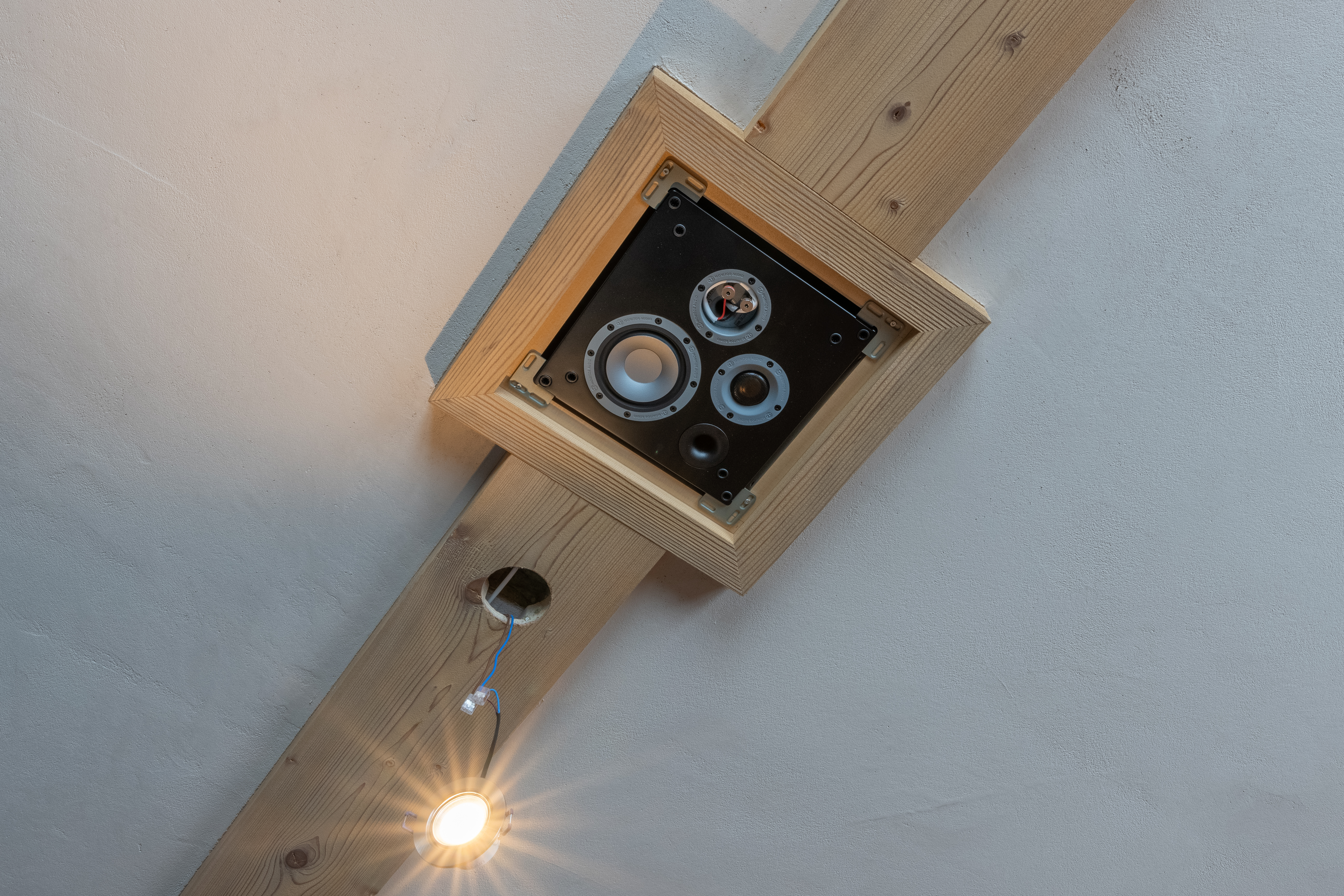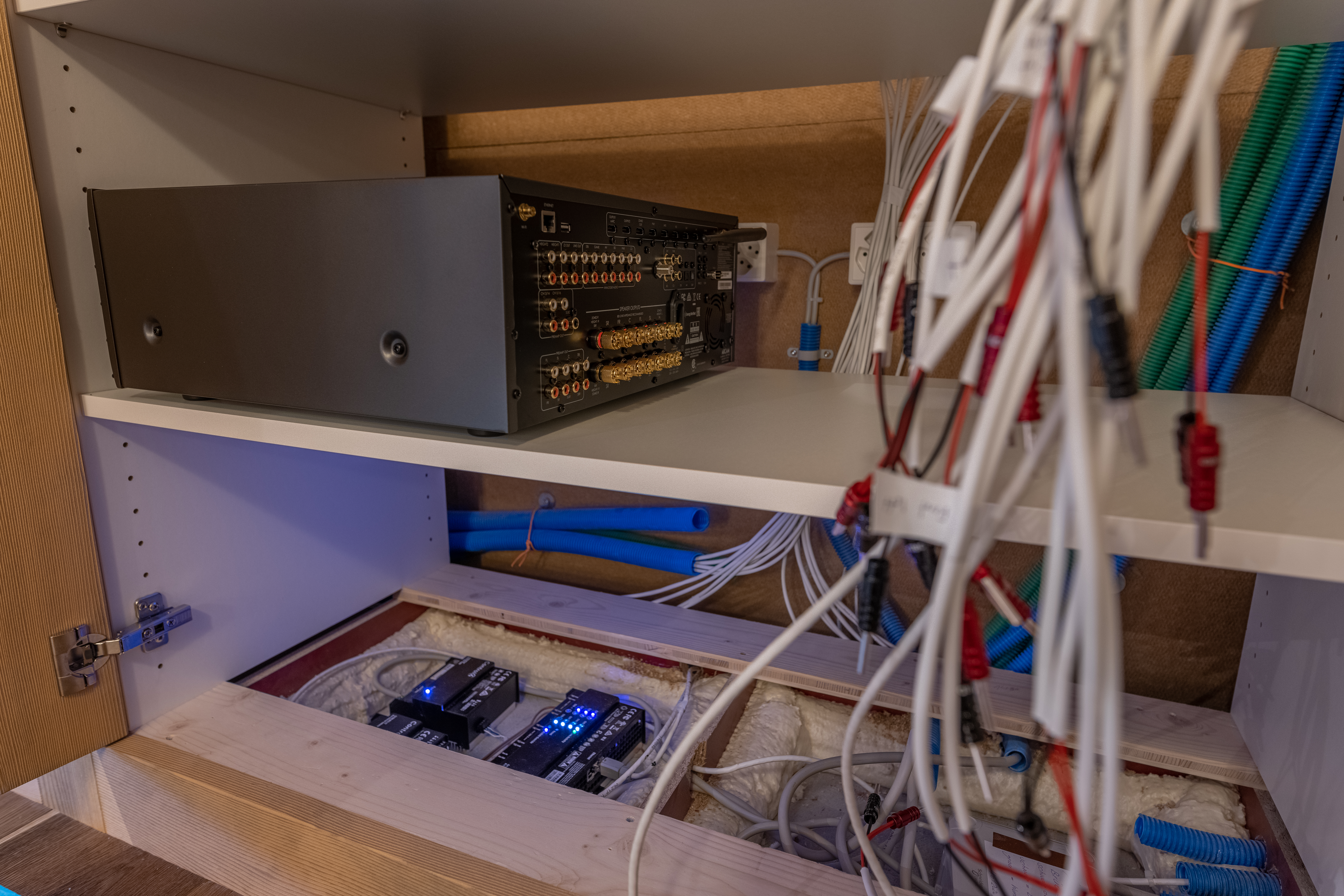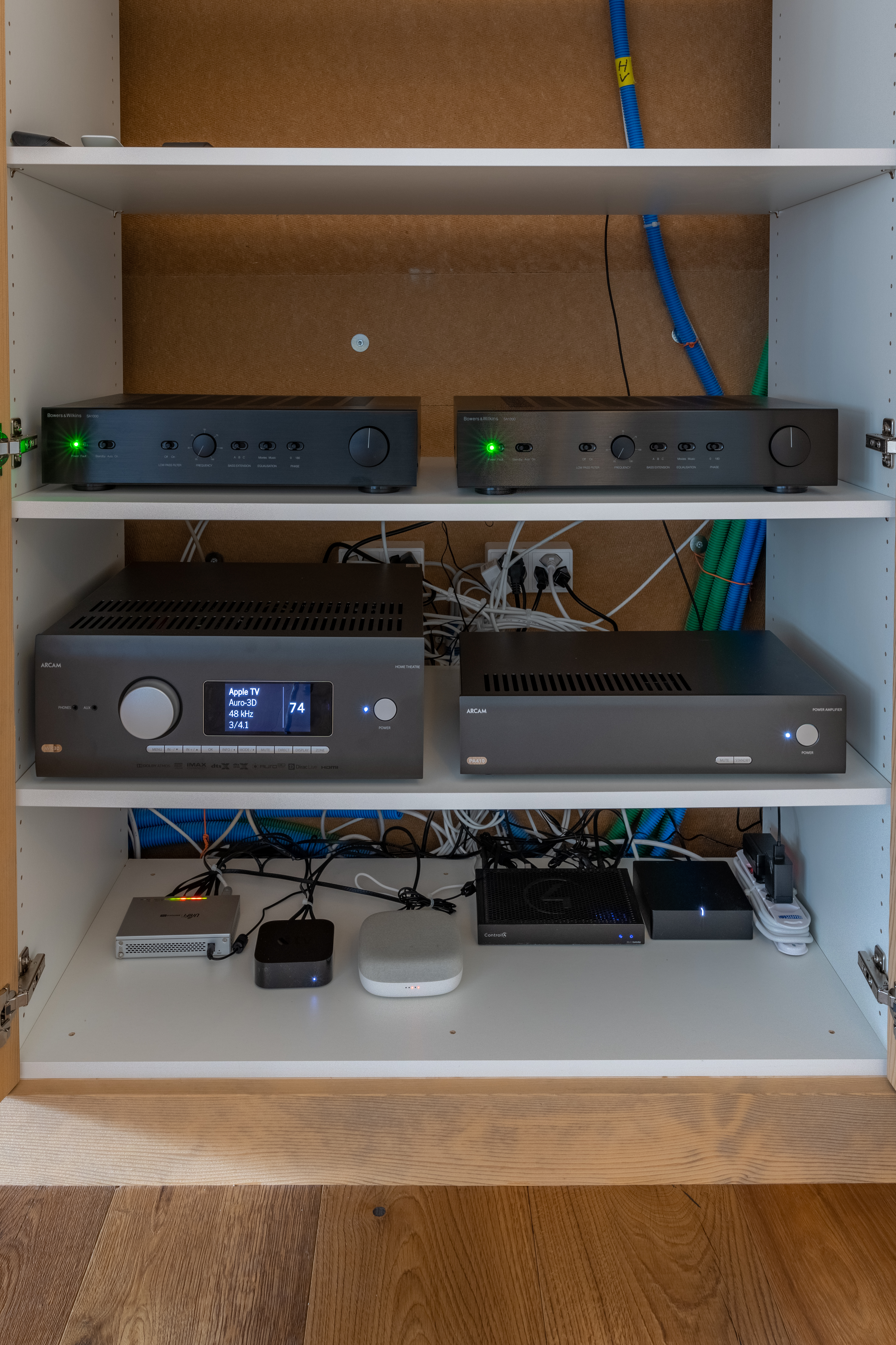 Die Beratung mündete in einer 5.2.4 Kinokonfiguration mit Einbaulautsprechern von Bowers & Wilkins sowie Monitor Audio. Die Verstärkerelektronik kommt von Arcam mit dem AV-Receiver AVR30 für die Bowers & Wilkins Front-, Surround- und den Centerlautsprecher CT7.3 und der Endstufe PA410 für die vier Atmos-Lautsprecher von Monitor Audio. Die beiden 30cm Subwoofer CT SW12 von Bowers & Wilkins werden von jeweils einem eigenen 1000W Verstärker SA 1000 II betrieben.