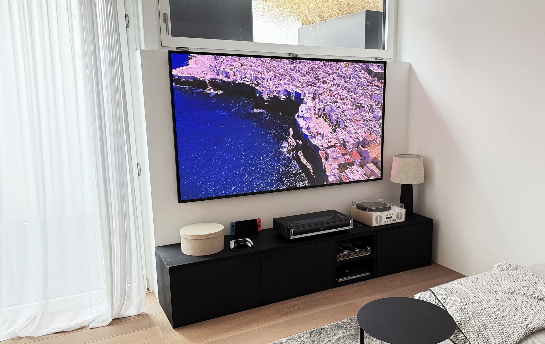 Der Projektor wurde dezent auf dem Lowboard platziert, während die schlanke Leinwand wie ein grosses Design-Display wirkt. Das Ergebnis ist eine minimalistische und stilvolle Lösung, die Technik und Wohnästhetik perfekt verbindet.