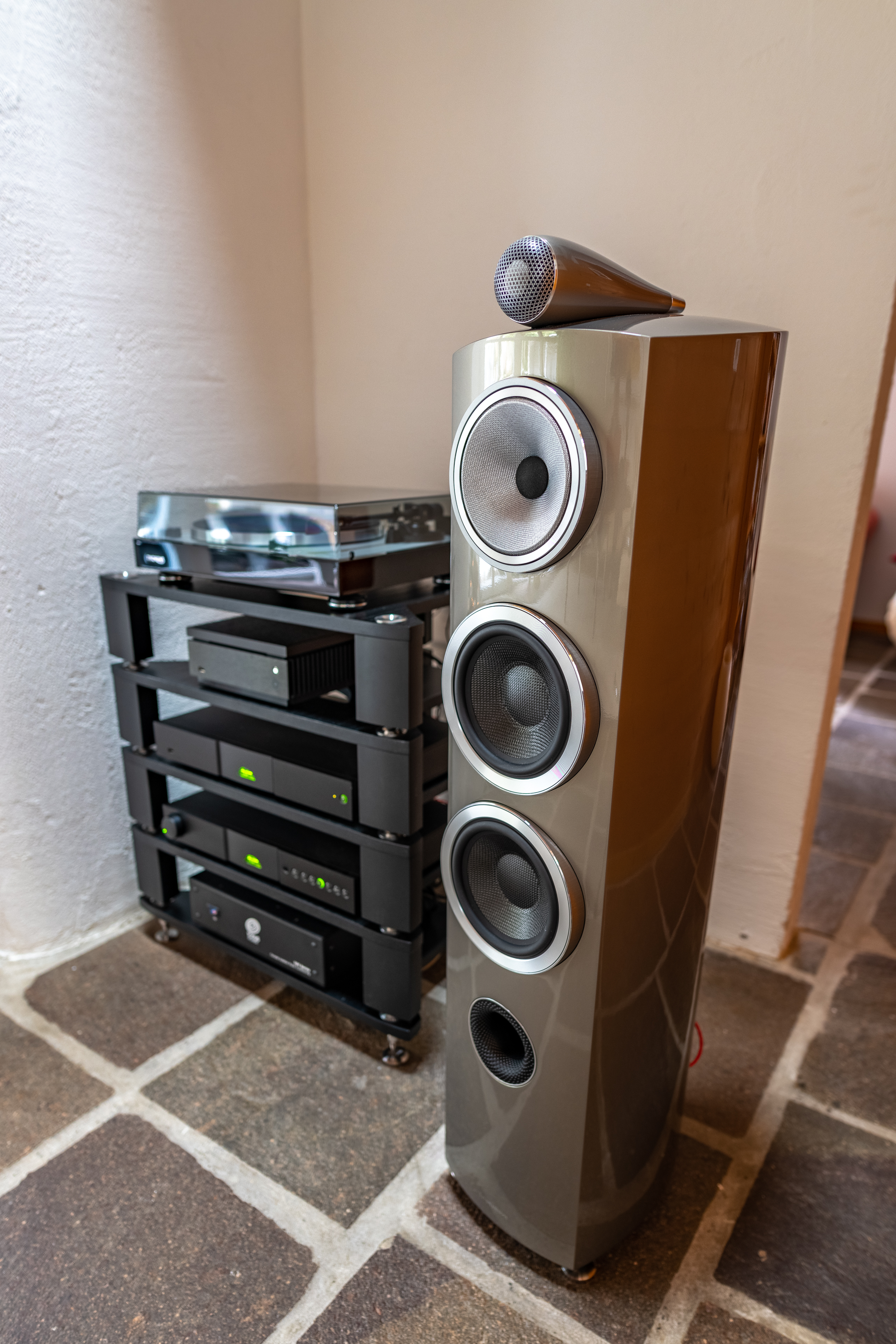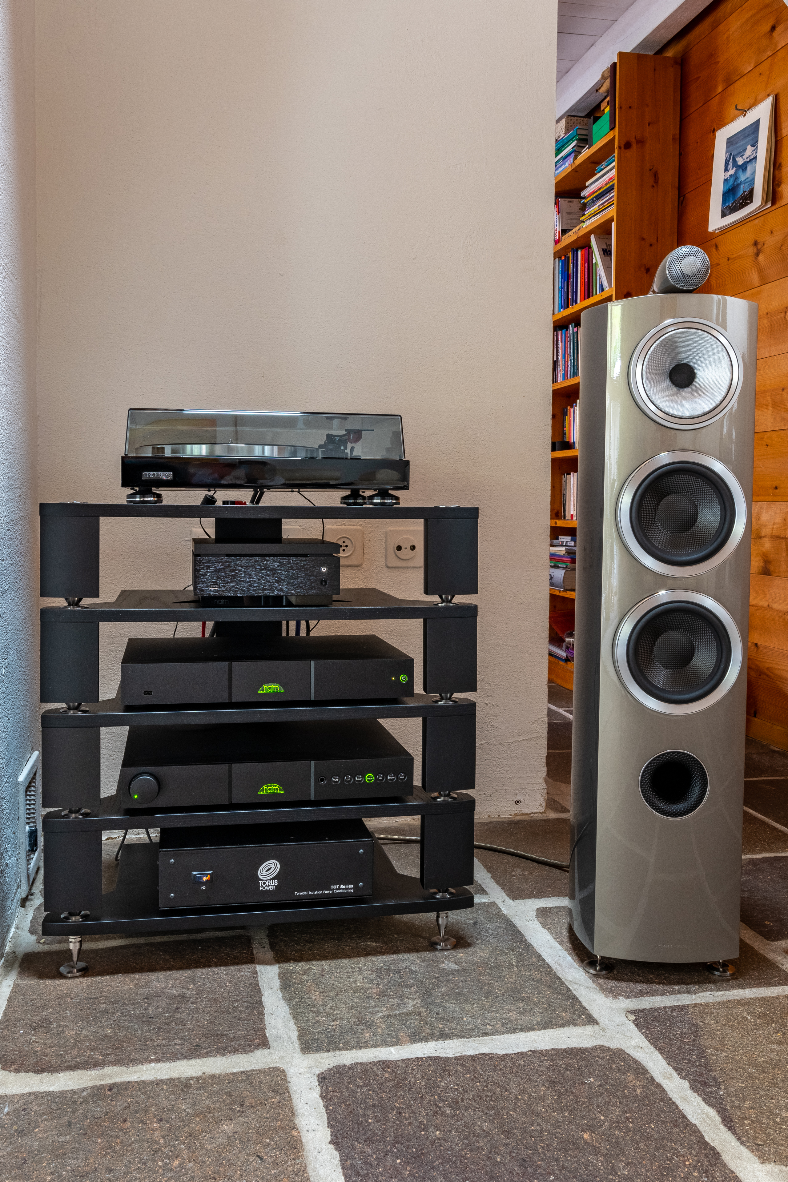 Der Vollverstärker Nait XS3 treibt die limitierte «Mystic» Edition der 804 D3 von Bowers & Wilkins an. Als Zuspieler fungiert der Streamer ND5 XS 2 sowie der CD-Ripping Musikserver Uniti Core. Auch der bestehende Thorens Plattenspieler findet wieder sinene Platz auf dem HiFi Rack Fraim, welches ebenfalls von Naim stammt.