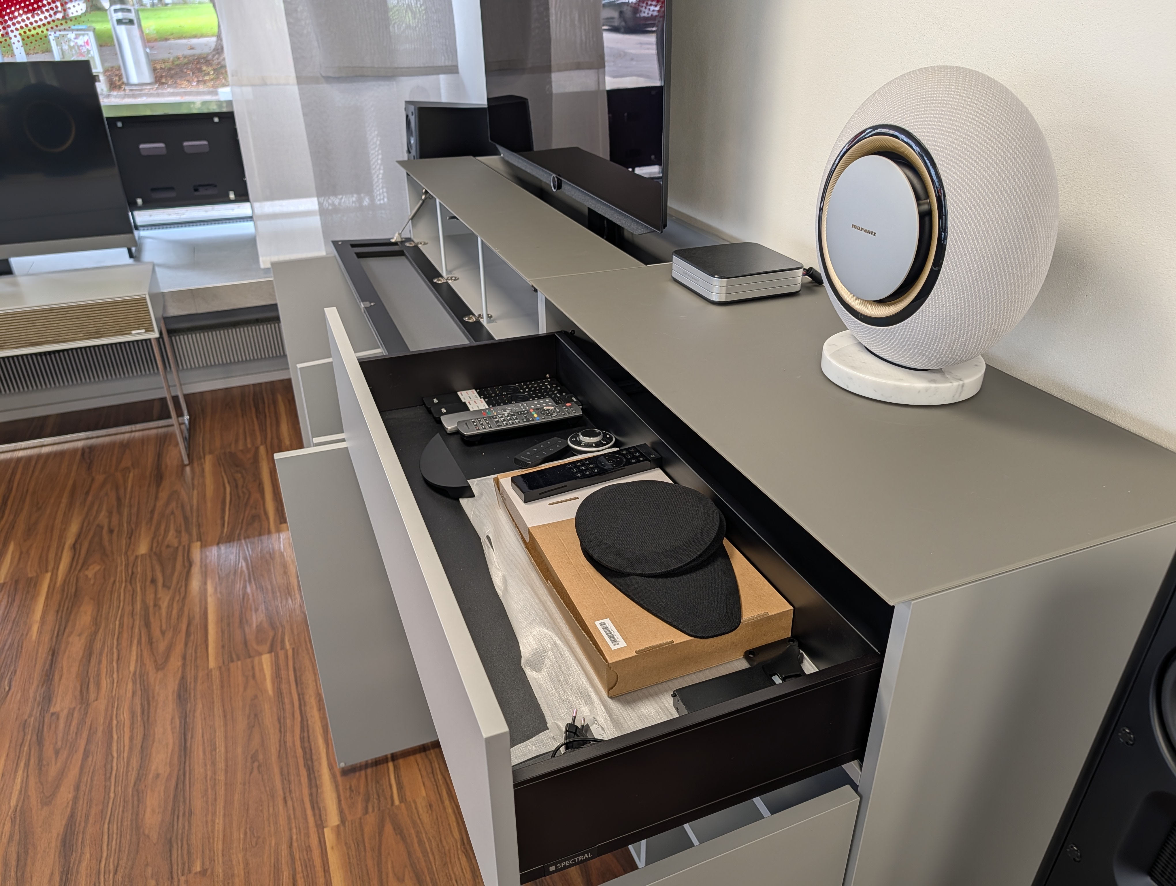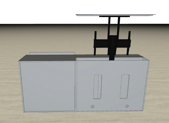 Der TV-Lift ist komplett unsichtbar mit einer eigenen Glas-Deckplatte ins Möbel integriert. Per Fernbedienung wird Ihr TV sichtbar.