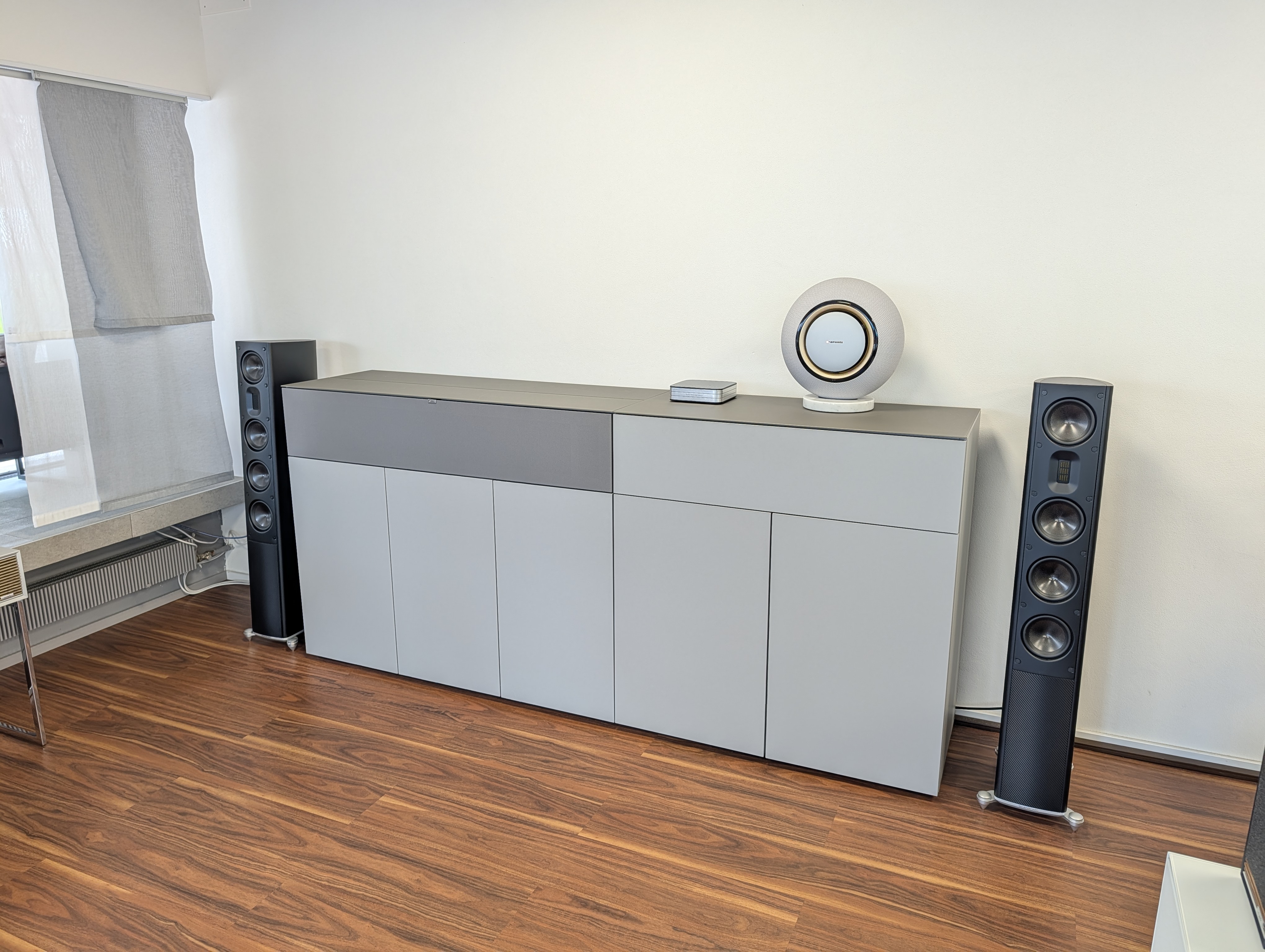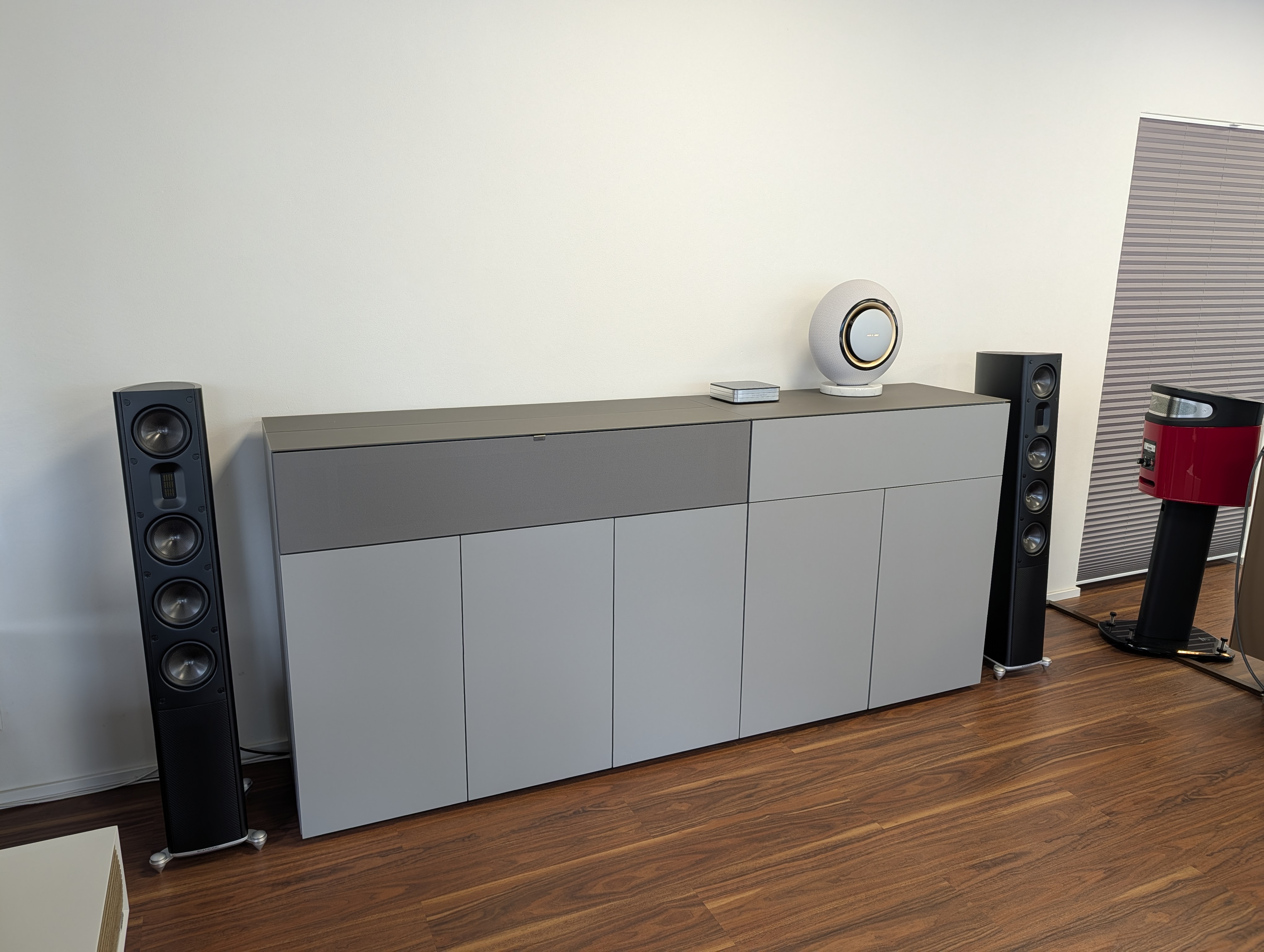 Deckplatte in grauem satiniertem Glas, Seiten und Front in grau lackiertem Holz. Die Klappe des Soundbar-Faches ist mit grauem Stoff bespannt.