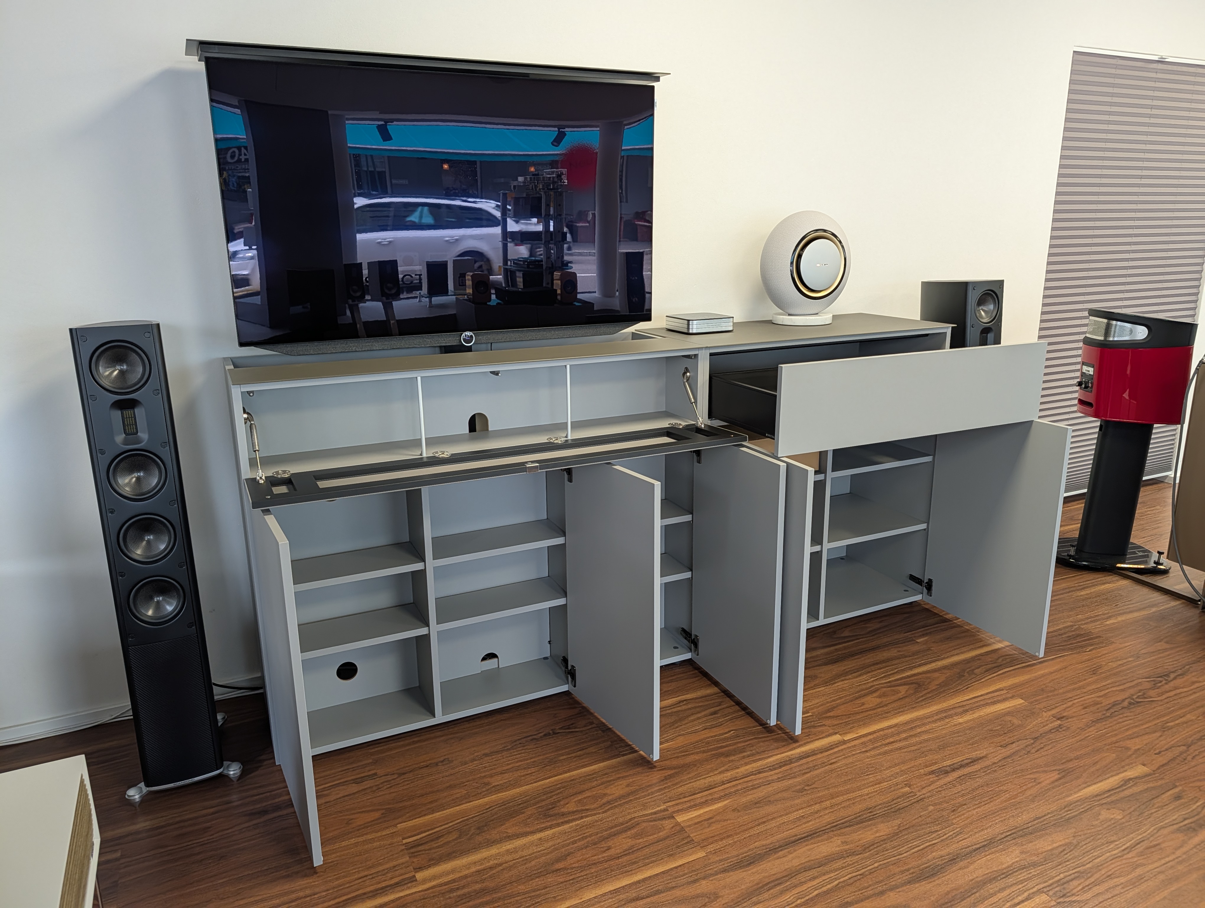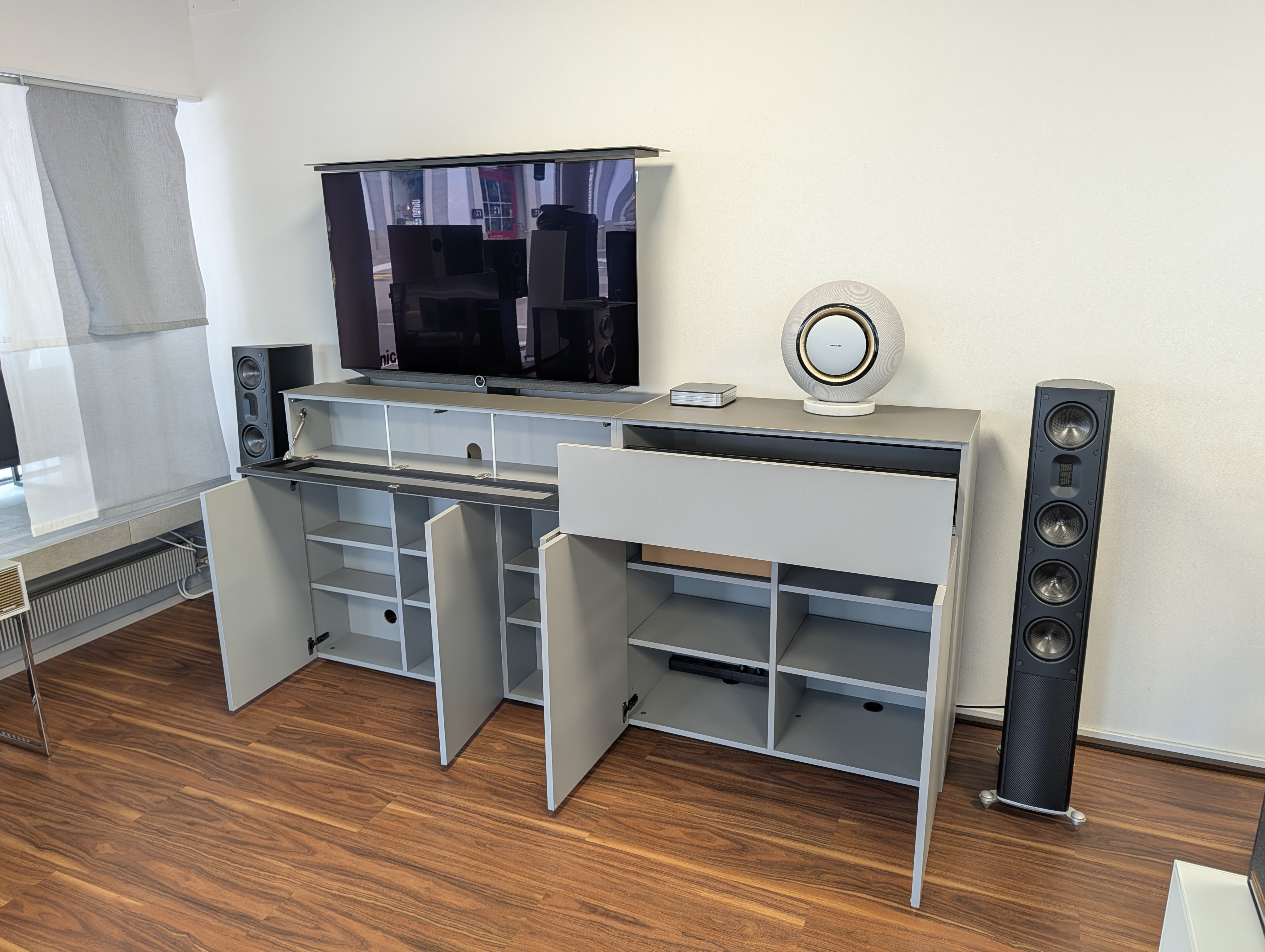 Elegantes Sideboard mit Schublade, Türen sowie einem TV-Lift für Geräte bis 55″/139cm Bildschirmgrösse und einem Fach für eine Soundbar. Die Kabelzuführung erfolgt elegant über die Rückseite.