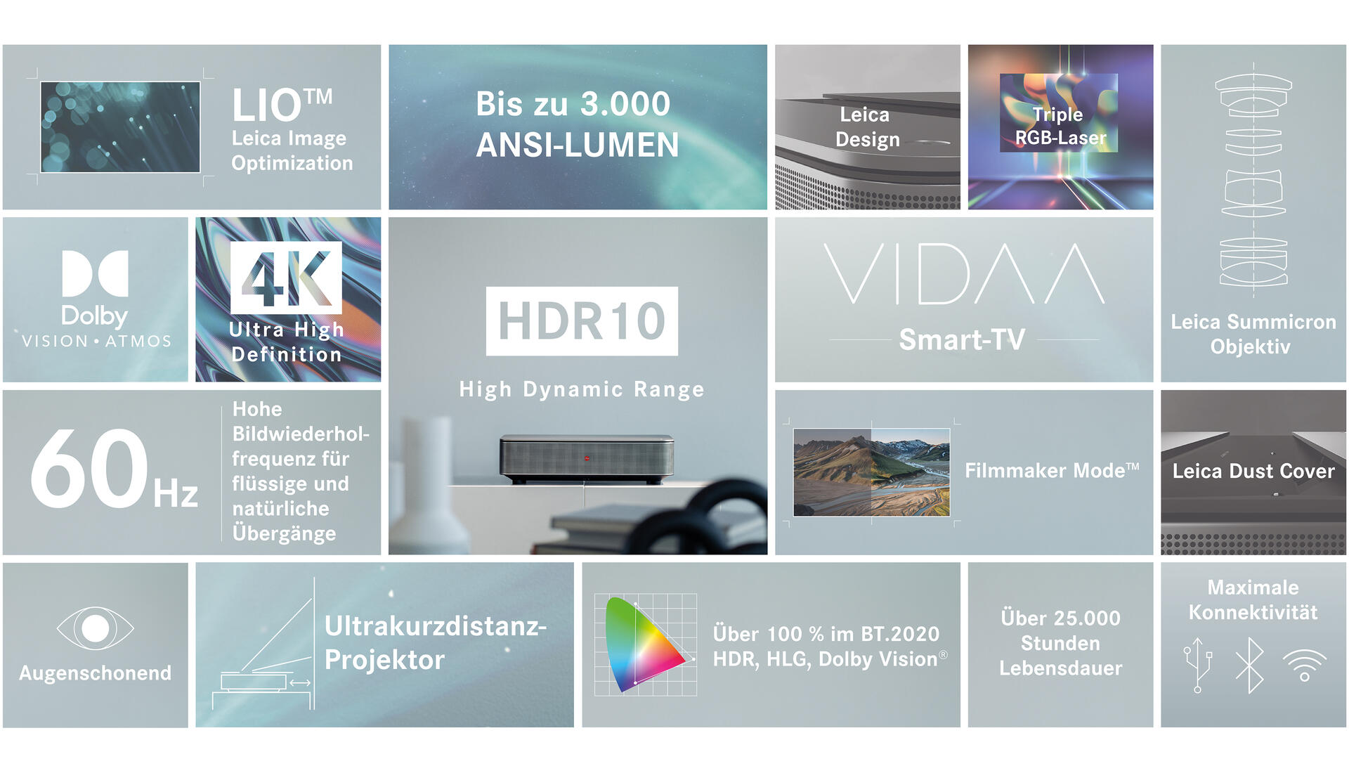 Im Zusammenspiel aus Realität und Fiktion treffen modernste Technologien auf maximale Konnektivität und höchste Standards in Form und Funktion. Triple RGB-Laser, Leica Image Optimization und das Leica Summicron Objektiv ermöglichen die Projektion einmaliger Bildwelten selbst aus kürzester Distanz auf die Leinwand – in 100″ und 120″ Bildgrösse. Darüber hinaus machen smarte Funktionen wie Smart-TV-Oberfläche inklusive Sprachsteuerung, Triple-Tuner, Apple AirPlay oder der direkte Zugriff auf Streaming-Plattformen diesen Laser-TV zu einem All-in-One Entertainment-System für ein Heimkino-Erlebnis in voller Bandbreite. Das anspruchsvolle Leica Summicron Objektiv ist mit vier asphärischen Linsen nach Leica Standard gefertigt. Fixiert auf die Bildgrösse, sorgt es für eine gleichbleibend hohe Abbildungsleistung. Damit werden der unverwechselbare Charakter und die herausragende Qualität eines Leica Bildes erstmals in 4k Auflösung mit 100 und 120 Zoll Bildgrösse erlebbar.