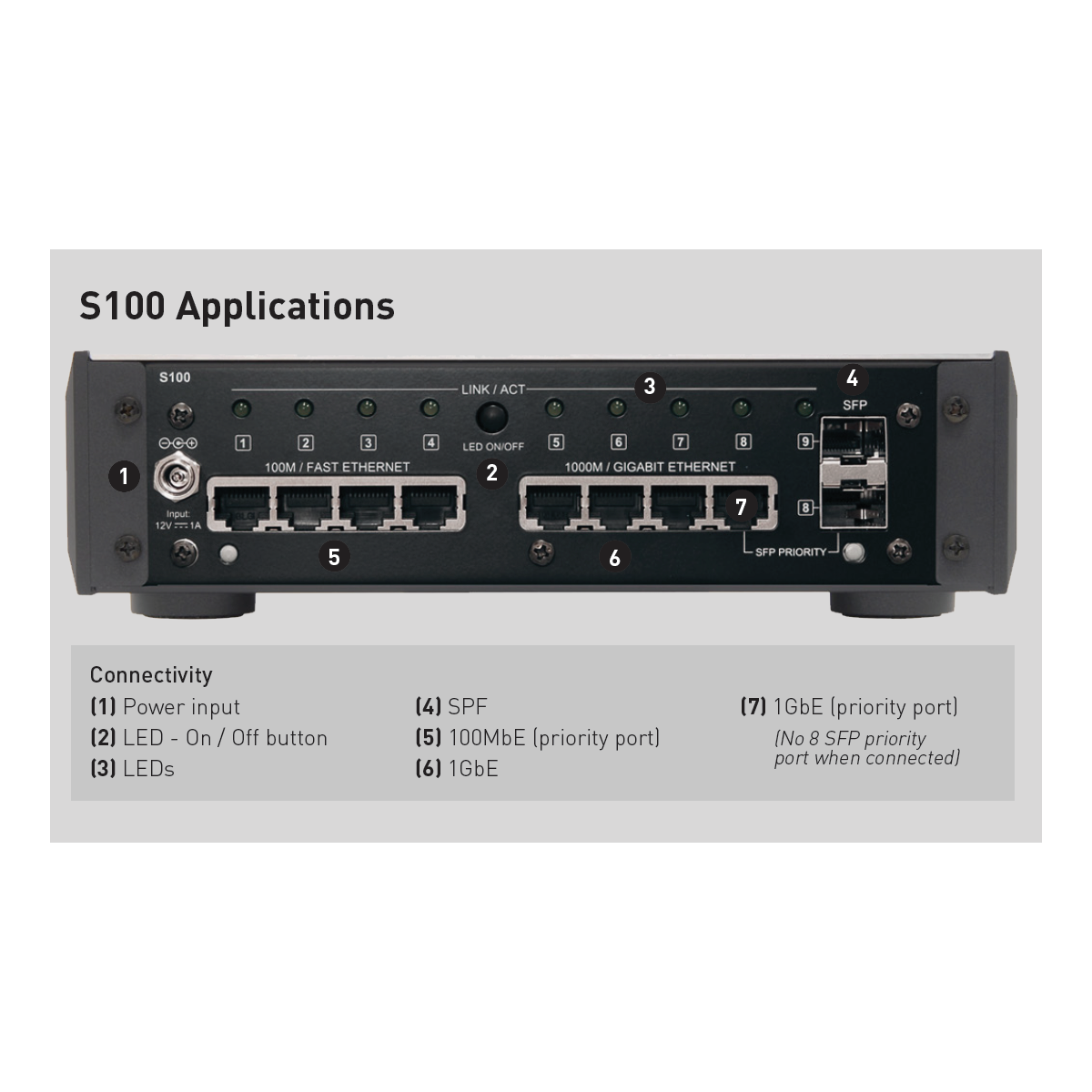 Im Vergleich zu einem gewöhnlichen IT-Switch bietet der S100 eine außergewöhnliche Architektur mit vier 100-Mb-RJ45-Ports für die beste Audioqualität und vier 1-Gb-Ports für PC-Konnektivität und andere Geräte mit hohem Datentransfer, wie z. B. den Roon Core-Prozessor.