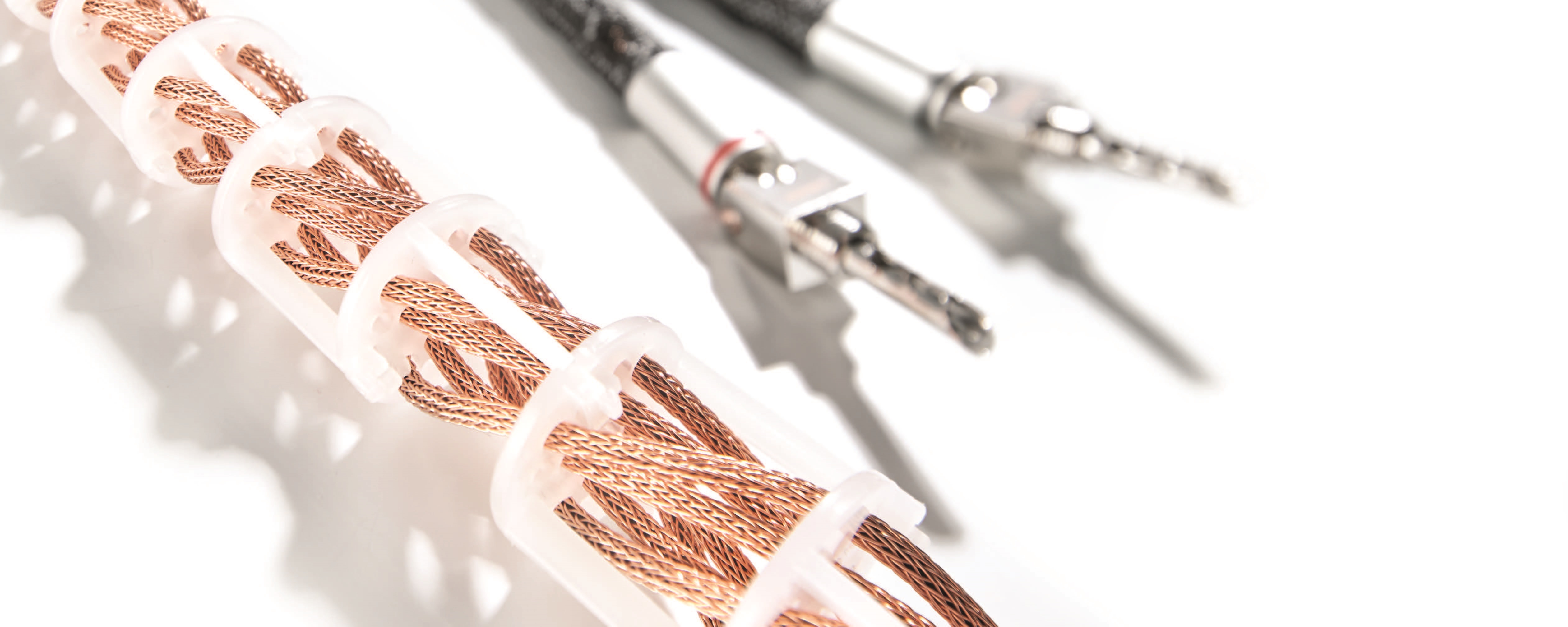 Der Air-Helix-Aufbau ermöglicht einen nahezu 100-prozentigen Luftanteil zwischen den Signal-leitern. Speziell entwickelte Clips bilden das tragende Gerüst. Im Kabelinnern aneinandergereiht, führen eine Vielzahl der Clips die Signalleiter helixförmig frei in der Luft durch das Kabel. Die Flexibi-lität dieser Konstruktion wird über zwei Stege erreicht, die die Clips gleichermaßen zusammen und präzise auf Abstand halten. Diese Architektur ist einzigartig. Das Ergebnis sind niedrige Leitungs-kapazitäten und geringe dielektrische Verluste – ein audiophiler Meilenstein für offene und unverfälschte Klangerlebnisse.