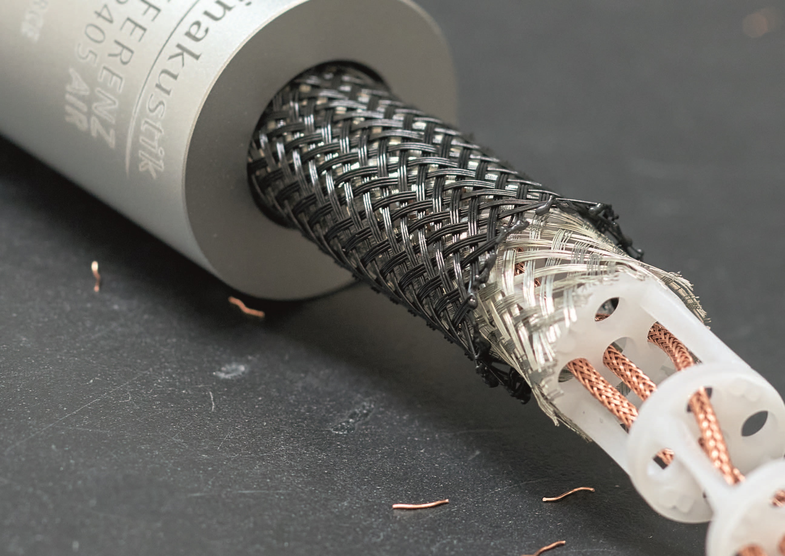 Das Leitermaterial spielt eine wesentliche Rolle bei der Übertragung von Tonsignalen. Jede Verunreinigung im Leitermaterial behindert den Stromfluss, verschlechtert den Leitwert und erhöht das Grundrauschen, das sogenannte Schrotrauschen. In unseren Referenz-AIR-Kabeln verwenden wir deshalb nur reines, sauerstofffreies Kupfer (OFC = Oxygen-Free-Copper) oder hochreines Silber. Beide Materialien verfügen über einen ungestörten, hohen Leitwert. Bei der Verwendung von Kupfer legen wir besonderen Wert darauf, dass ausschließlich hochreine Kupferchargen verwendet werden. In aufwendigen Verfahren wird die Qualität des Kupfers ermittelt, bevor es im Drahtziehwerk über mehrere Stufen auf den benötigten Durchmesser gezogen wird.